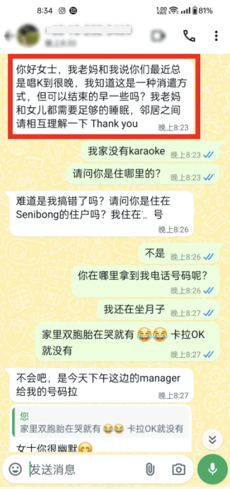 一名华裔宝妈在社交媒体贴出WhatsApp对话截图,显示她收到陌生男子传来讯息,称她们一家最近连夜K歌,打扰到他们休息。