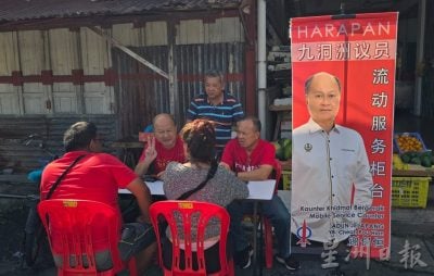 每周分别在九洞巴刹、第一花园商业区和万里望蓝瓦的流动服务柜台,有效收集居民的投诉和建议。坐者左为谢保恒及右是怡保市议员段国其,后为九洞新村管理委员会主席叶荐发。