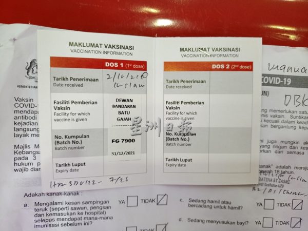 记者也查看今天接受第一剂疫苗人士所获取的预约卡,并无注明下一剂的接种地点;凡落在本月16日过后的第二剂预约,接种者必须留意手机MySejahtera程式的通知,他们可能被安排在附近的卫生诊所和外展计划,甚至私人诊所完成接种。