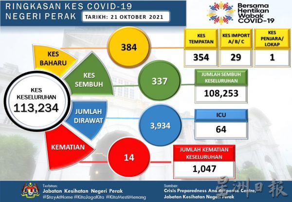 根据霹雳州卫生局发布最新的冠病数据显示,州内今日有14人染疫死亡,累计的死亡人数达1047人。目前州内仍有3934人在接受治疗,加护病房治疗的病患人数为64人;今日痊愈的人数则有337人,累计痊愈人数为10万8253人。