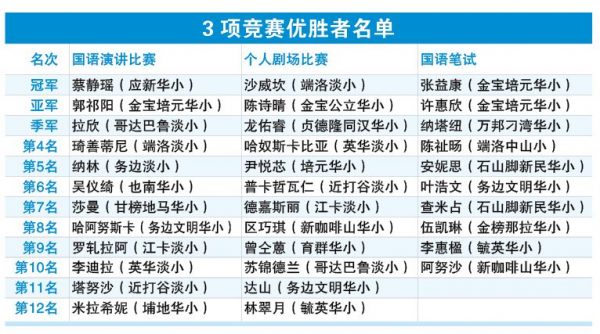(金宝23日讯)南近打县华淡小委员会于日前举办个人剧场、演讲及笔试赛会。金宝培元华小荣登3项赛事总冠军宝座,而演讲比赛冠亚军及个人剧场冠军将代表南近打县出征于7月23日在太平举行的霹雳州赛。