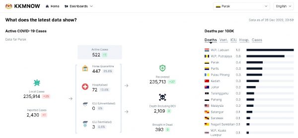 根据KKMNow的数据显示,霹州有447名(85.6%)患者居家隔离中、72宗(13.8%)在医院治疗、3宗(0.6%)在加护病房(ICU)并需要呼吸辅助器。