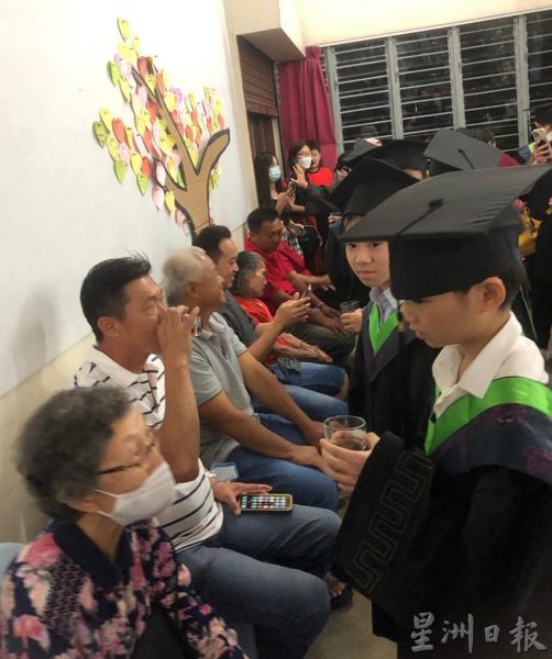 爱大华民德华小日前在该校礼堂举行第77届六年级暨第一届学前班毕业典礼,总数82名的小六毕业生,在仪式上一起向各自的家长敬茶,以表感恩。