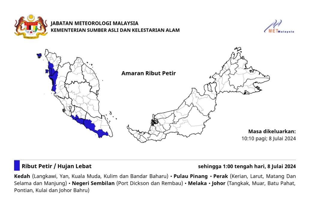 气象局于今早10时10分发布警报指出,上霹雳一带包括吉辇、拉律、峇登、司南马县、曼绒将受到闪电、雷雨及强风侵袭,直至下午1时。
