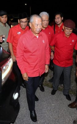 慕尤丁在该党霹雳州主席拿督斯里阿末法依沙陪同下,于晚上8时33分步入珠宝甘榜加沙礼堂。