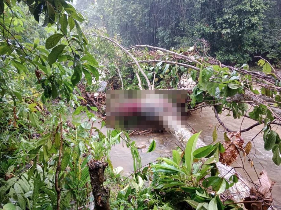 原住民在河畔发现卡在树枝上的可疑包裹,内里证实装有人类遗体。(警方提供)