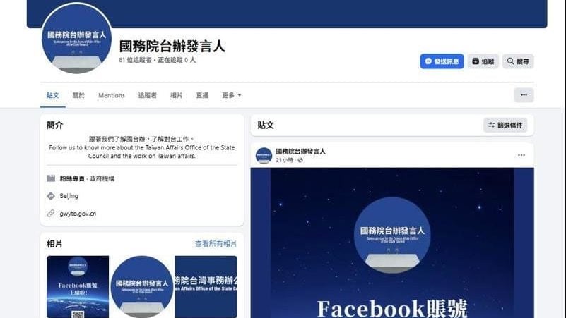 中国国台办开设脸书账号 加强对台湾新闻发布工作