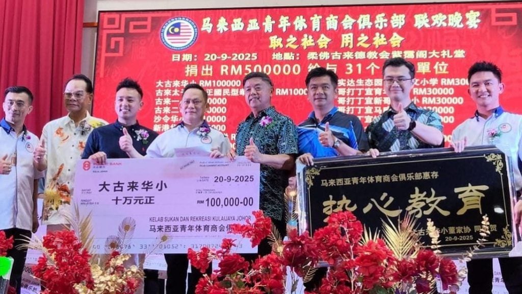 (古来21日讯)马来西亚青年体育商会俱乐部在昨晚筵开450席的联欢晚宴上,捐献50万令吉给全柔多所华小及慈善机构,共有31个单位受惠。