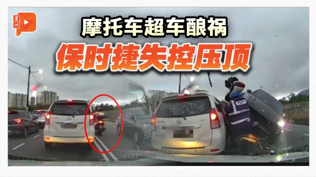 槟城白云山路发生惊险连环撞!一名摩托骑士越双白线超车,与迎面而来的保时捷相撞,保时捷失控弹起“压顶”另一辆摩托车。警方已介入调查。