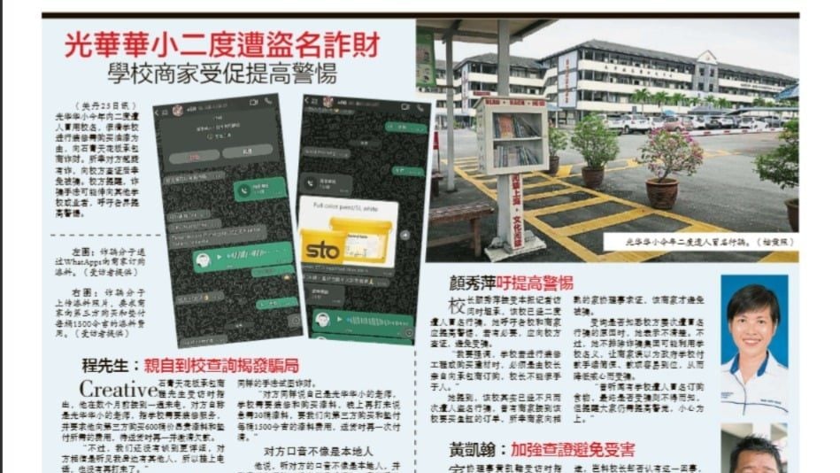 学校遭诈骗集团冒名行骗的事件屡见不鲜,近日光华华小再度成为冒名诈骗的对象。诈骗集团冒用家协名义,向商家提出油漆服务及订购30张白钢床,声称校方急需安装,企图混淆商家视听以达行骗目的。所幸五金商察觉买家行为可疑,及时向家协理事求证,才揭发这场骗局。