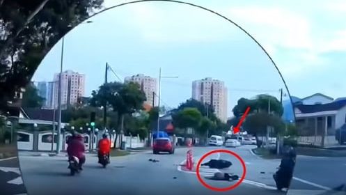 一辆轿车涉嫌违规超车后,撞倒一辆闯红灯的摩托车,之后驶离现场