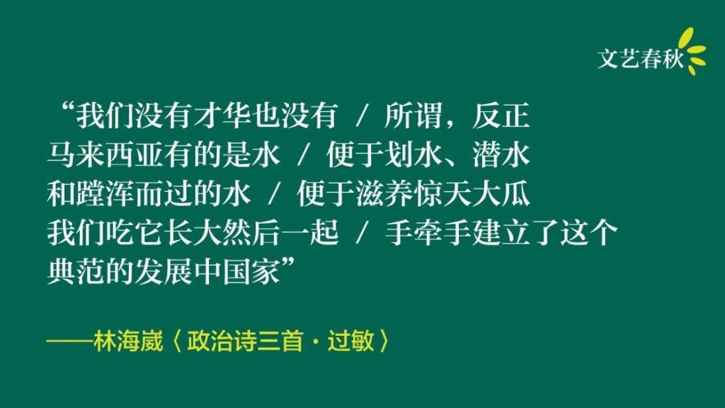 01 洗白计划—— 发生于赵明福事件十六周年的道歉 嗨,亲爱的阿占巴基 我想约你和我一起 逛2nd Street 反正我们都喜欢捡 现成的便宜 让我们一起来欢快地捡漏,捡 五块钱的Tods 十块钱的Coach 十五块的Burberry和 二十块的Santoni…… 在那个无人知晓的角落,它们排队 一件接着一件 跳楼 噢,亲爱的阿占巴基 虽然你的budget真的有点紧 但放在FD十六年的那一句sorry 已经利滚利 并足以大大方方地拿出来 收买 世界上任何钱也买不到的东西 很cheap,真的很 CHEAP 原来这些我们弄坏了理应赔不起的东西 这么便宜 (周年庆那天,还会再折扣二十巴仙!) 噢,亲爱的阿占巴基 是你给了这些被遗弃的东西 第二个生命 所以请不要觉得不好意思 尽管买爆它 然后丢进你家的洗衣机 洗香香 洗白白 洗掉上一手残留所有的痕迹 然后一排接着一排 晾在五楼的阳台 风将会吹干 上流遗忘的恩典 阳光将照亮那条 原因不详的抛物线 然后明天我们将一起 穿着新衣服上班 02 过敏 当一根离家的猫毛出走到鼻窦 我费尽洪荒之力拼凑的一江滥作 是透明得没有杂质的泡沫 我们无能为力且一无所有 赘词与冗句横流 如忘了关的水龙头 澄澈而纯粹而真诚地 寡淡 我们没有才华也没有 所谓,反正 马来西亚有的是水 便于划水、潜水 和蹚浑而过的水 便于滋养惊天大瓜 我们吃它长大然后一起 手牵手建立了这个 典范的发展中国家 这里的一切都很 水 威水、吹水和 给马打喝咖啡的水 物资丰饶,四季如夏 ——这里不需要才华 你又何苦,在用力之后遮掩 那些索然无味的泡沫 宏愿已过去了多少年 我们早习惯把这些老水的事迹 赤裸摊呈于赤道的阳光下 而且很有礼貌地 从不戳破 猫毛继续卡在体内某一个 神秘的角落 一块没有雨的荒漠 痒痒地拂过 那没有六块的核心和 年久失修的肌肉 剧烈地挤兑,挤兑,再挤兑 通过胃,通过肺 通过所有欲张欲阖的穴 然后轰然爆烈 哈!哈!!哈!!! 哈啾!!!! Excuse me 我从来不知道自己存了那么多的水 它气势磅礴,冲破手纸,冲破 Rojak般暧昧不明的语言 冲破3.3座堤坝 冲破希望,冲破谎言,冲破最高法院 冲破水鱼们栖息的巢穴 冲!破!一!百!年! 并在停滞时定格于一场 黄绿色的脓液 (仿佛痊愈之前) But sorry loh 那水依旧是没有任何颜色的水 而我依旧是没有任何才华的我 03 诗之国—— 致异端、致从地表掉进路洞的游客,和那个从高楼坠落到地表的人 在这座诗意盎然的城市里 Metaphor以各种形式流窜—— 释放不等于无罪,吹哨者优先被捕 说你异端是一种违宪但无关你是不是异端 在这个政党轮替了N次但依然由同一批人执政的诗之国 我们有理由相信U转也可以是一种 转型正义 明喻、暗喻、借喻皆迷失在这座 复杂错综的诗之国 拟人化的足印像游客般 夸张地陷落于本体、喻体、喻词排比而成的路洞 在这个永远在建构新修辞的城市里 人可以像榴梿一般啵地一声掉进了排粪管 而我们继续堵塞在导航里不断延长的梦 终点如2020的先进国 大音希声,大悲无恸 在这座黑与白悄悄对偶的城市里 自杀可以举行在婚礼之前 坠落不过是一道划向未来的升职曲线 No Further Action并不是一种沉默而是一种静静的 行 动 山巅之上的那些人全都在痛心疾首 So Apa lagi you mahu??? (这是反问) 行将就木的人和他四十八万种过时的修辞学一起 飞向了一场远在日出之地的论坛 完全没有一点快要死掉的迹象 因此你无须为三个月后出现的遗书义愤填膺 在这个充满Metaphor的诗之国我们有理由相信 它和一千两百万张选票、百岁人瑞的宣言 以及吵了半个世纪的统考文凭一般 不过是一些五年一度的 顶真 就在你自愿性留下来过夜的十六年后 我们发现两千四百元的国旗从未消失 它穿过了AI们狼狈的竞逐 免费地落在了诗之国孩子们的胸口 他们是Metaphor未来的主人翁 相关文章: 林海崴/一颗消失的星球引发的祭典 孙天洋/政治感冒诗四首